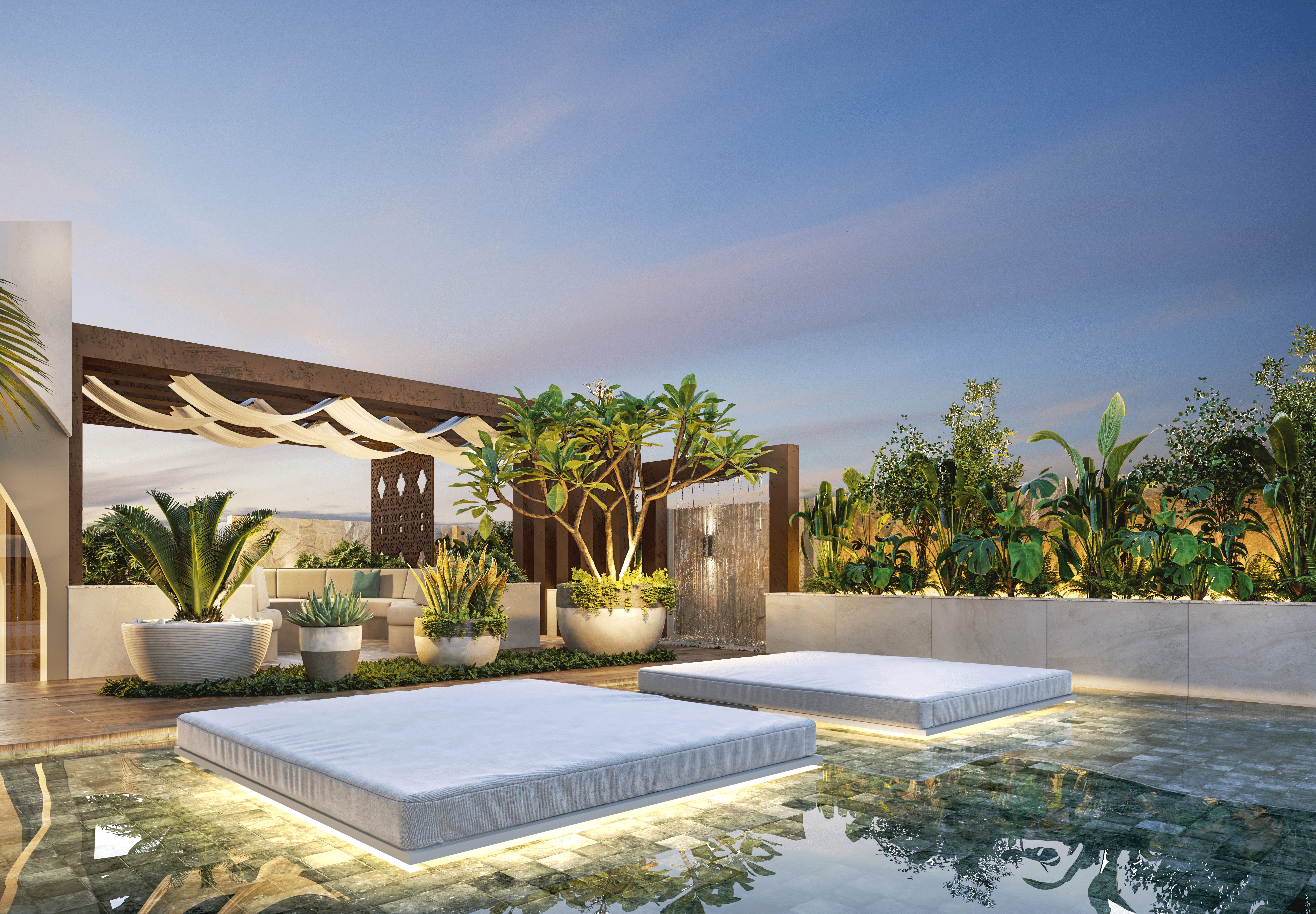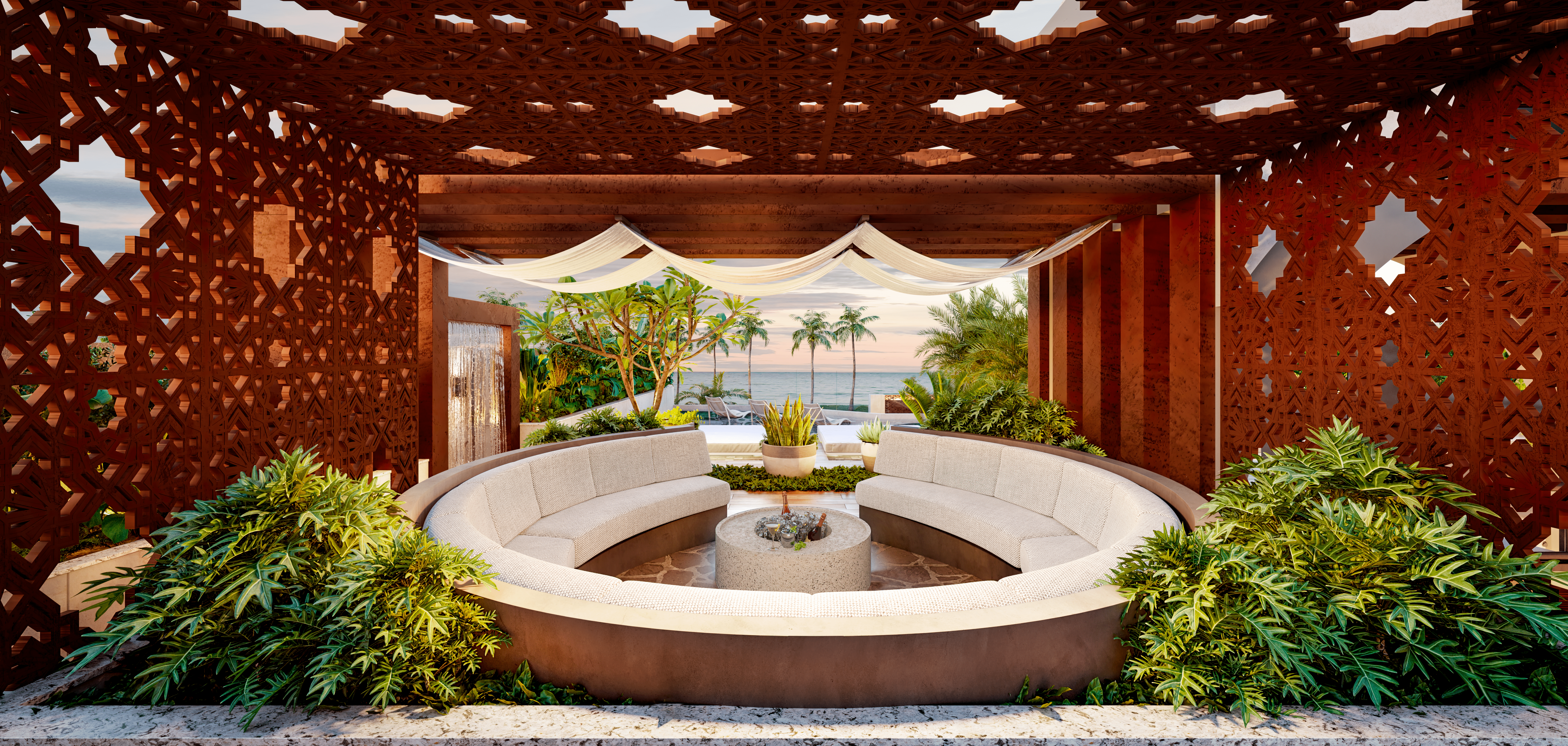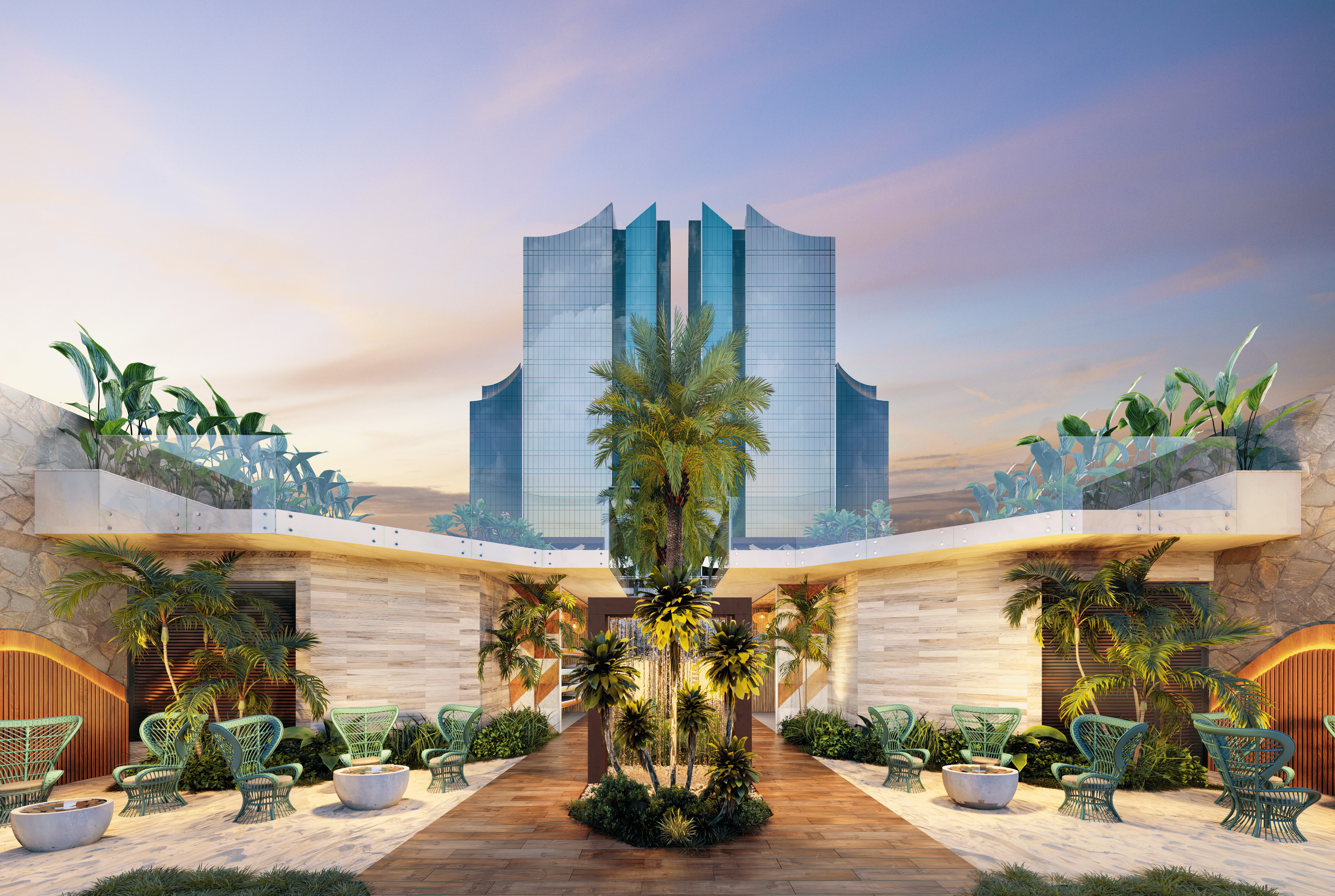 Karol Simonasse conta que o Beach Club, localizado em frente às torres Mirage e Lótus, possui uma arquitetura de luxo privativa e foi projetado “com identidade praiana em volta de grandes palmeiras, que dão a sensação de estar em um verdadeiro oásis particular, com segurança, sofisticação e conforto”.